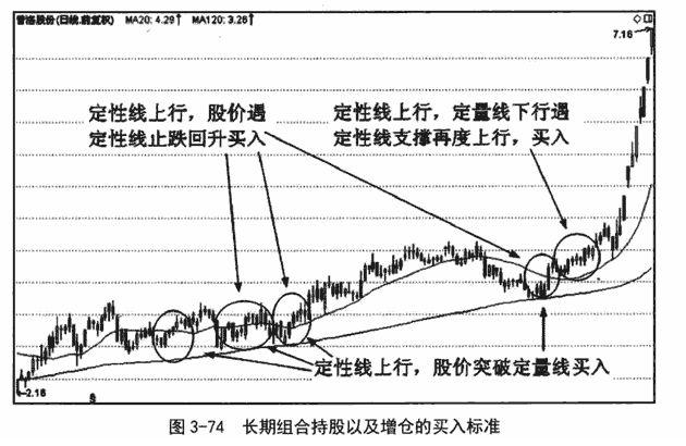 月均线组合(如图7-14)是由5月、10月和20月均线组成的均线系统。同样是均线,月线的可信度最大, 周线次之,然后才是日线。 当然,有的投资者喜欢分析年线或者分钟线。月均线出现看涨组合后股价.上涨的概率较大,周均线出现上涨组合的可信度也很高, 而日均线出现骗线的概率则较大。因此,在运用均线组合预测后市行情时,日均线必须配合周均线和月均线使用。