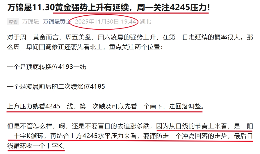 昨天黄金没能冲上去,站稳4245这一关键水平压力位,晚间还是压制下跌,那么黄金是见顶下跌还是多头修正?昨天黄金整体走势基本符合预期,周末的视频中咋们就强调过4245这个关键的水平压力位,日线很有可能走冲高回落,收一个十字K,果然不出意料。