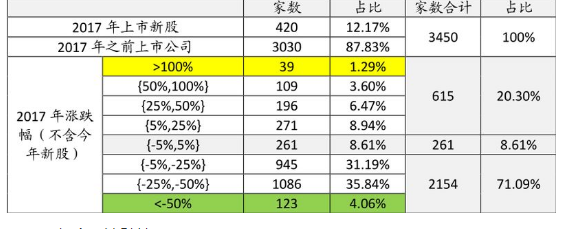 截至2017 年12 月15 日,3030 家2017 年之前上市的公司中,涨幅超5%的公司家数占比略超1/5,跌幅超5%的公司家数占比超7 成,腰斩的公司高达123 家,是涨幅翻倍公司家数的3 倍。2017 年指数呈现温和上涨局面,市场结构则出现剧烈变化。