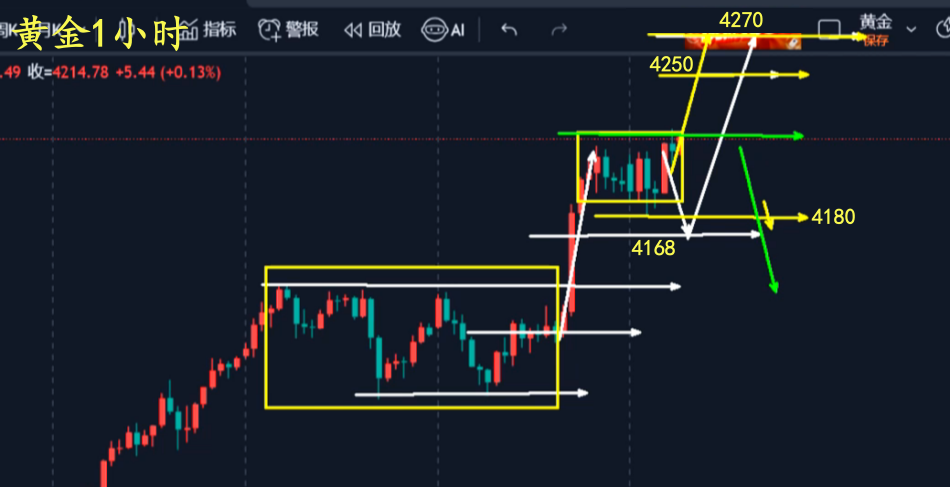 那么在强势行情中,高位横盘也是修正的一种,在午后2—3点可以直接去看北上,继续的去看欧盘上升破高,不用再等4168—4169这个支撑位置,压力还是一样4250—4270!