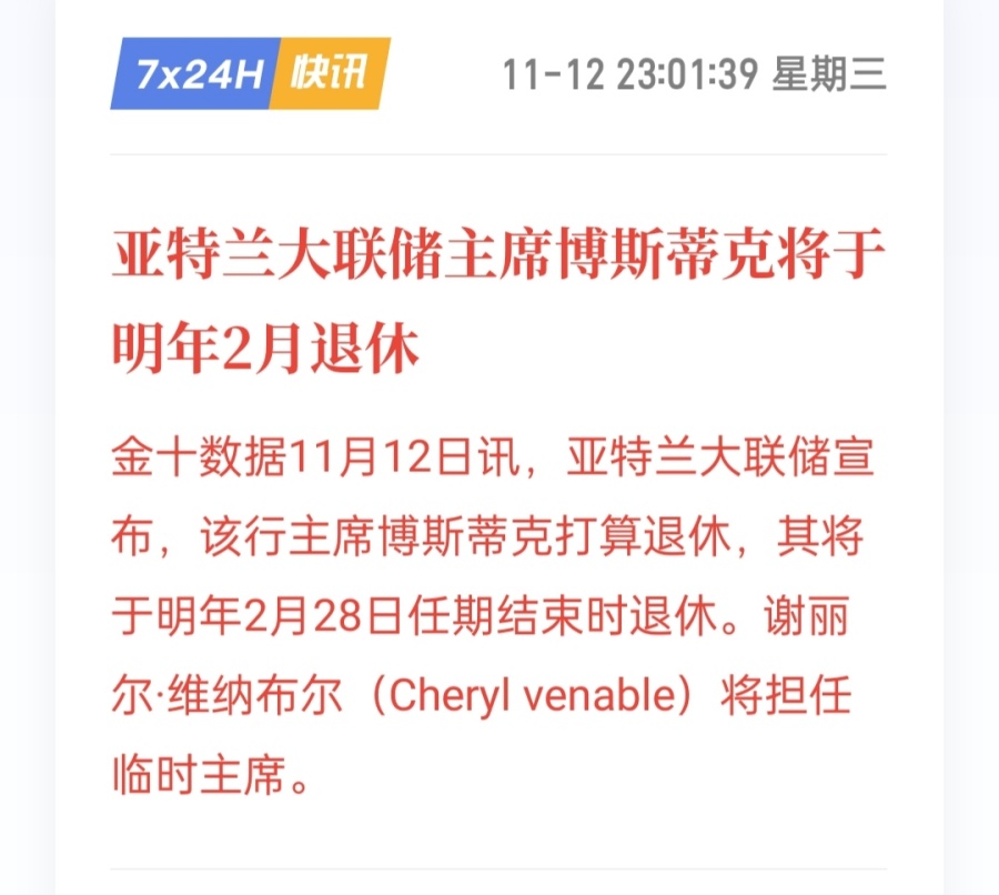 可能很多人要问,为什么昨天黄金横盘震荡了一天,却在晚间美盘十一点后才开始发力上升破高?这里有一个消息面,可能很多人没注意,在十一点的时候亚特兰大联储宣布,该行主席博斯蒂克打算退休,将于明年2月28日任期结束时退休。