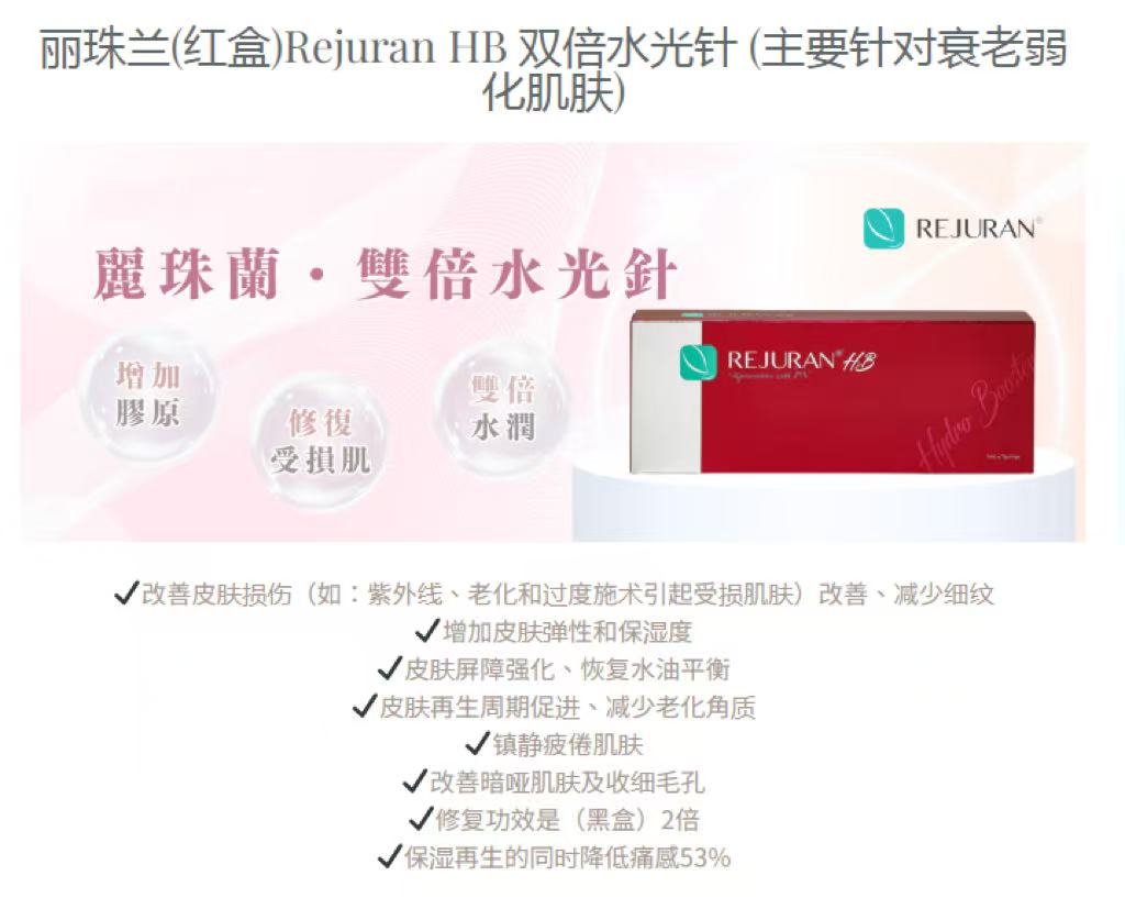 丽珠兰红盒是丽珠兰系列中唯一含有透明质酸和局部麻醉成分的产品。它在PDRN的基础上,额外添加了非交联透明质酸。这种独特的配方结合了PN的长效再生功效与透明质酸的即时保湿能力,能达成双重效果。它不仅能深层补水,让肌肤喝饱水,还能提升肌肤紧致度,改善松弛下垂问题,有效对抗肌肤老化,对于极度干燥缺水肌肤和肤色暗哑也有很好的修复作用。由于红盒当中的多核苷酸的颗粒非常大,所以直接上手打会有疼痛感,而添加了利多卡因的红盒则可以很好地改善痛感。