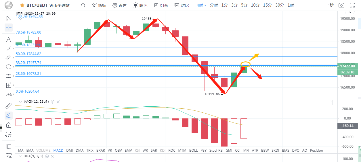 比特币行情分析:比特币自冲高19485一线后承压回落,直接下跌近3000点,最低至16200一线,目前行情反弹上行运行在17422一线。从四小时图看,布林带张口运行,K线重回布林带内运行,5日均线开始延缓下跌趋势在币价下方形成短暂支撑,附图MACD双线死叉在零轴下方运行,红色动能柱持续缩量,KDJ三线粘合有形成金叉之势关注公众号:彤欣言币。比特币自大跌后需要修复指标,有反弹需求,我们依托斐波那契线,日内关注上方0.382一线即17450一线的压制,若顺利突破企稳,行情将继续向上试探,反之延续下跌局面。