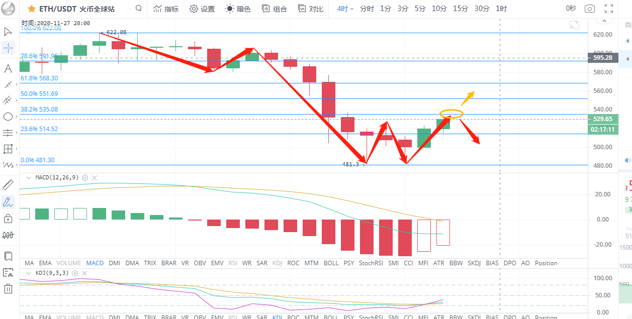 以太坊行情分析:以太坊联动比特币下跌跳水,最低至481.3一线后反弹,目前运行在529一线附近。从四小时图看,布林带张口运行,币价重回布林带内运行,5日均线平行运行在下方形成短暂支撑。附图MACD双线死叉在零轴下方运行,红色动能柱持续缩量薇eth34368。KDJ三线金叉向上发散。以太坊目前有反弹需求,日内关注上方斐波那契0.382一线即535一线压制。若能够上破企稳,行情将继续向上试探,反之有继续回落的风险。