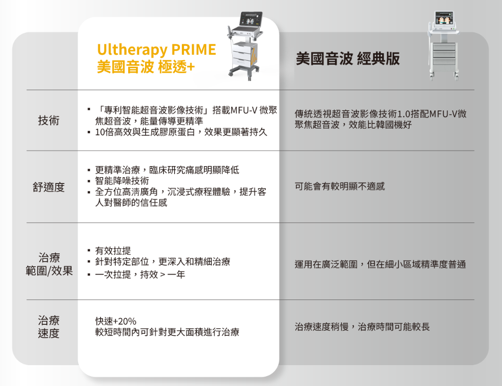 与一代Ultherapy疗程相比,二代Ultherapy prime疗程时间缩短了20%,体验更快且更有效率,一次疗程就能达到自然持久的提升效果。而发数与使用位置和效果紧密相关,并非一味提高发数就适合所有人,治疗发数需依照医师判断和用户实际需求来选用。