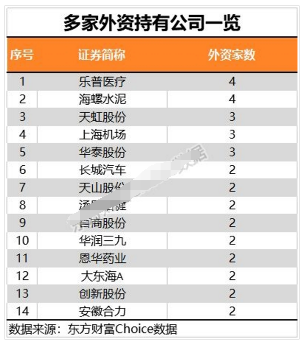 而在这54家公司中,还有14家公司被多家外资持有,其中海螺水泥和乐普医疗分别被4家外资机构持有,是这些个股中外资参与最多的公司。