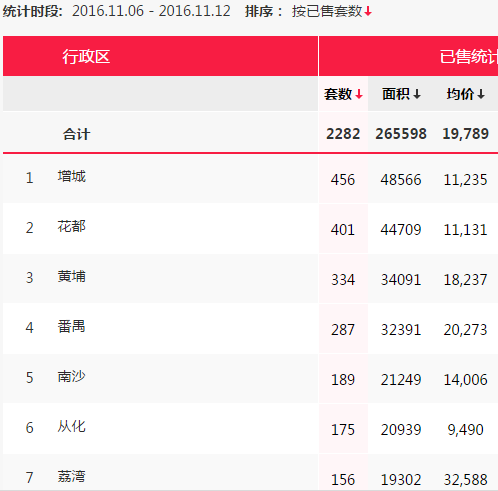 据网易房产统计阳光家缘成交数据显示,上周(2016.11.6-11.12),广州十一区共成交一手住宅2282套,环比微涨3.3%,成交均价环比涨14.8%,达19789元/㎡,接近2万/㎡大关。