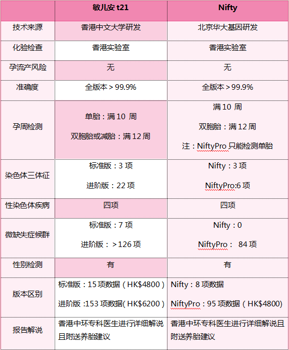 t21也属于nipt的检查范畴,有标准版和进阶版。标准版可检测14项异常,进阶版能检查23对染色体。对于有家族遗传病史,担心胎儿可能存在染色体数目异常或特定染色体微缺失/微重复综合征的孕妇,敏儿安T21能提供更精准的检测。无创nipt和t21分别适用人群其实都不差,只是nipt有着更丰富的检查类别,其中同属nipt测试的Blessgd宝儿安就能筛查66种胎儿新发突变的单基因病,现在和t21一起做能为先天缺陷筛查重重把关,在香港中环专科体检中心(微信:tchchk)的官网上预约,更有立减优惠和有机会获得专车往返接送呢!