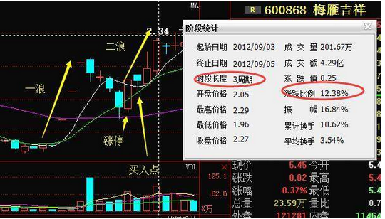案例2:梅雁吉祥(600868)在12年9月2号收了一个涨停板,第二天股价跌2%时着手买入,之后又收出两根阳线,三个交易如涨幅12%。