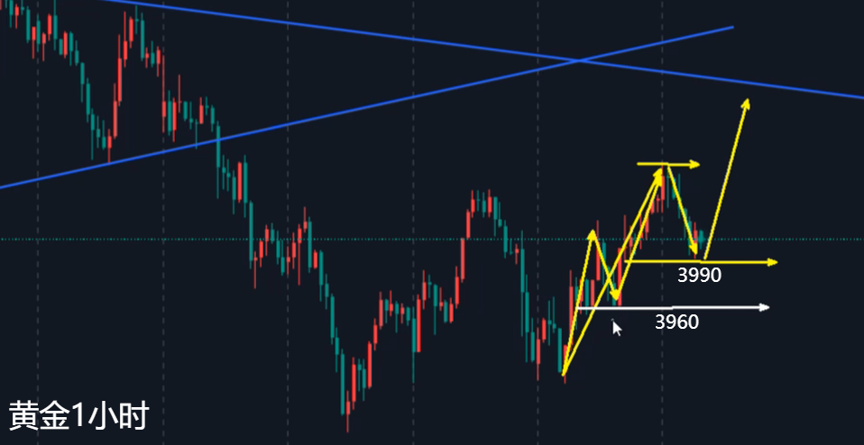 那么今天早间回落调整,午后围绕3990一线支撑看多,重点看欧盘走强,晚间延续,上方压力看4090一线,也就是上方趋势压制附近,第一次触及可以空一次,看一个回落,二次冲击压力线就直接看破位了。