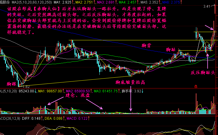 完整的赤脚图形实际上是庄家完整的建仓过程。由于这种图形往往是庄股启动前的征兆,被股民戏称“赤脚大仙”。遇到“赤脚大仙”时,买入太早了,怕“赤脚大仙”再睡一大觉;买入太晚了,又怕“赤脚大仙”飞奔。合适的买入位置,在股价放量冲过年线至前头部E点之间。