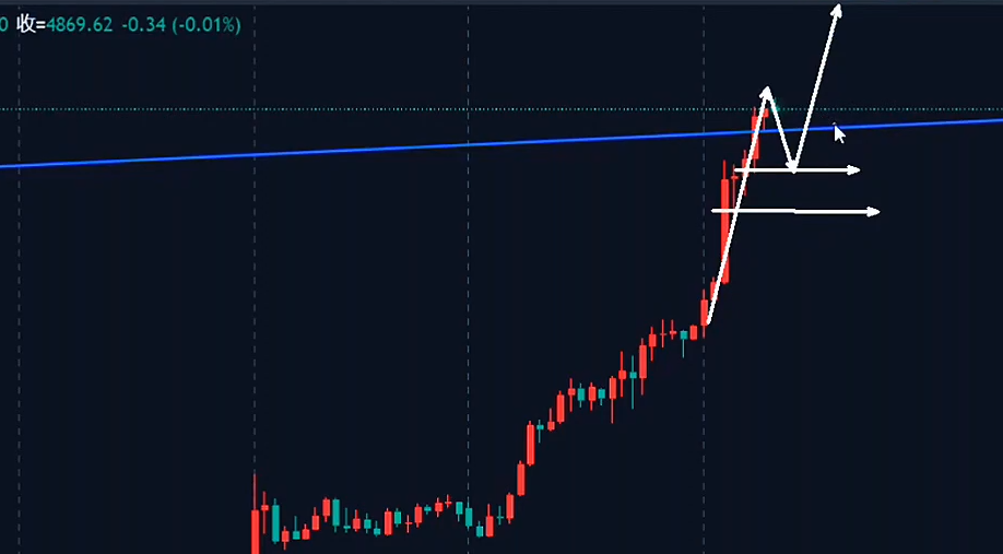 明天就转阴修正,或者转阴向下走,啊,这是我个人觉得可能会出现这么一个走势。所以,想要看南下的,一个是等4900关口附近,第二个是等晚间美盘十点之后,再去考虑。然后,大家一定要注意,如果哪一天出现早间大幅回撤下跌的情况,打破了早间极强,循环上升的这个节奏,那么就不要再看北上了。